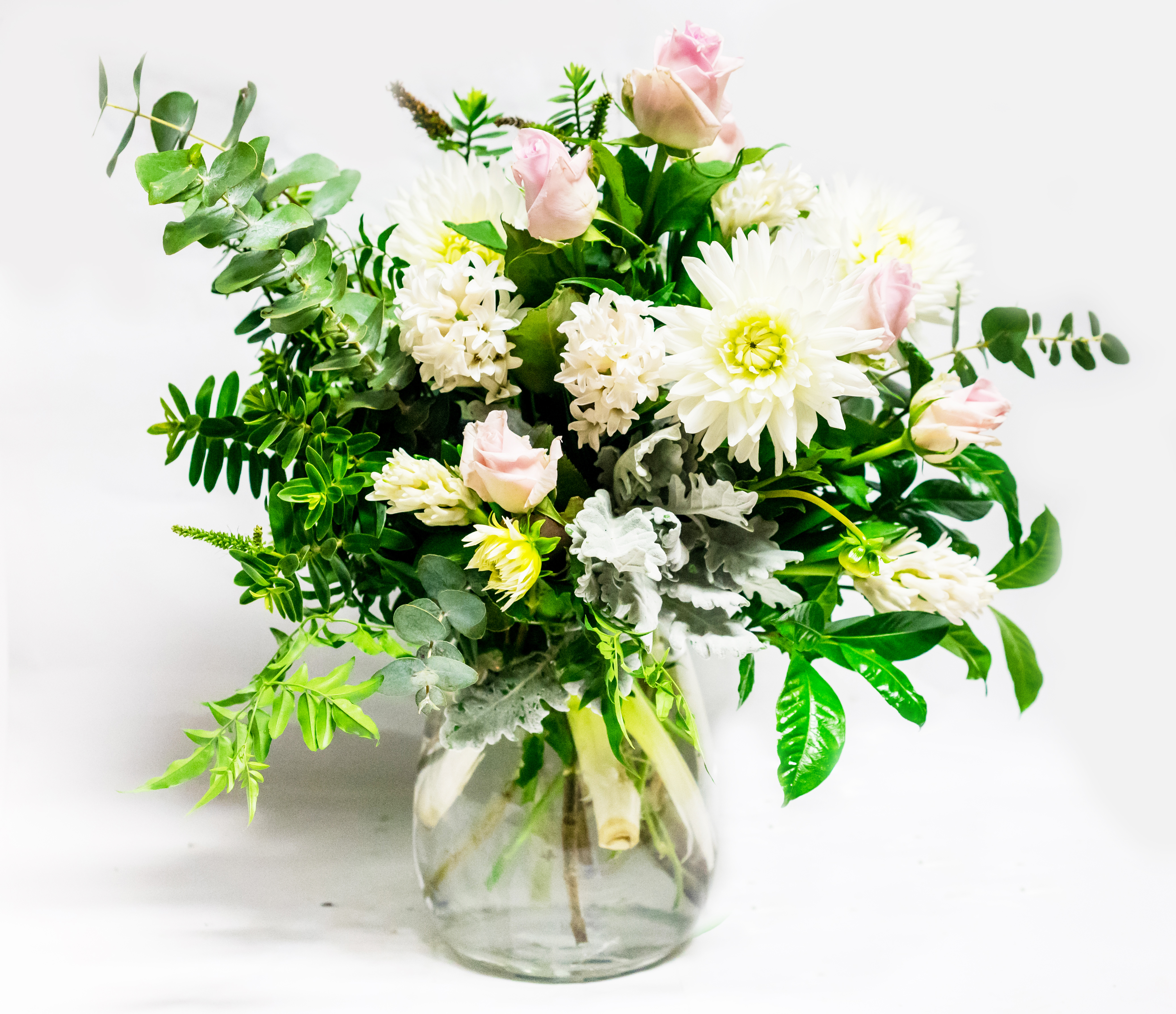 Soft gardeny looking flowers arranged beautifully in a large vase (price inclusive of vase)